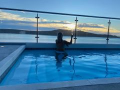 Luxury Room, Queen Bed with Bed End Ottoman with an- suite bathroom with Floating Glass shower, vanity, luxury freestanding bath in front of an oversize window with sea view. Private Balcony with full sea view corner wall windows to enhance sea view.